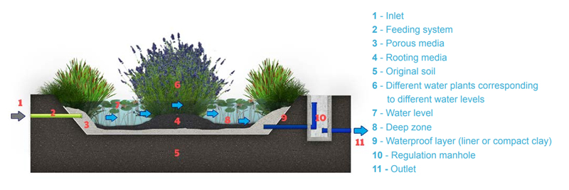 The wetland can hold a volume of water (from 0.5 to 1 metre deep) with various types of aquatic wetland plants, which could be submerged or floating. The plants act as the substrate in this case and incorporate nitrogen and phosphorus.